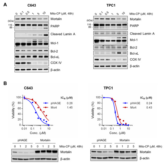 To determine the nature of Mito-CP-mediated suppression of these tumor cells, we conducted Western blot analyses of total lysates of C643 and TPC-1 cells treated with Mito-CP for 48 h. Consistent with its mitochondria damaging effects, Mito-CP decreased COX IV levels in both cell lines in a dose-dependent manner (Figure 6A). Under these conditions, we found that Mito-CP robustly induced the cleavage of lamin A and PARP in C643 cells but not in TPC-1 cells, while increasing the levels of Bcl-xL in TPC1 cells (Figure 7A). Mito-CP also significantly altered the pattern of Mcl-1 expression in both cell lines although it did not affect the levels of another anti-apoptotic Bcl-2 family member, Bcl-2, in these cells (Figure 7A). Intriguingly, Mito-CP downregulated mortalin levels in a dose-dependent manner in both C643 and TPC-1 cells (Figure 7A) while the lentiviral vector-mediated mortalin overexpression conferred partial resistance to Mito-CP (Figure 7B), suggesting that mortalin downregulation may be a mechanism underlying the toxicity of Mito-CP. These data suggest that Mito-CP can effectively suppress not only MTC but also PTC and ATC cells.