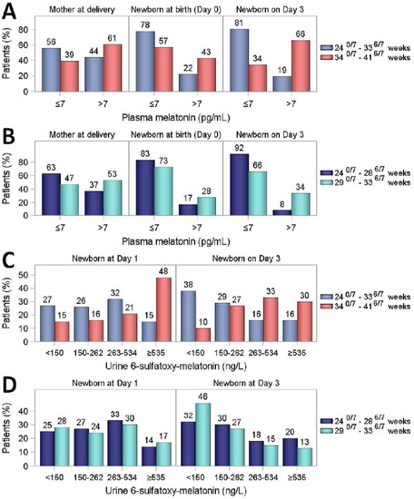 This prospective multicenter study found that plasma melatonin and urine aMT6s concentrations measured at birth and Day 3 in infants born before 34 GW were lower compared to those measured in more mature infants. In contrast, milk melatonin concentrations were higher in the group of mothers who delivered before 34 GW.