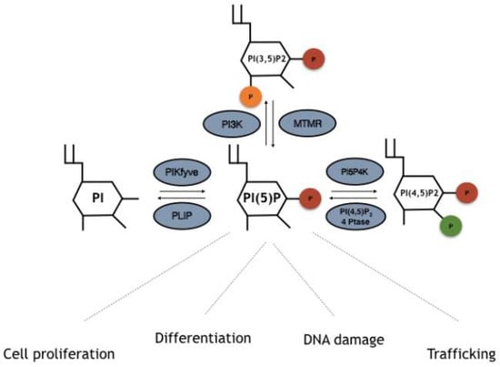 Seven different phosphoderivatives of PI are known to exist and these are modulated by an intricate network of enzymes whose related pathways often intertwine. Despite the rarity of these second messengers when compared with other lipids like phosphatidylcholine or phosphatidylserine (which represent around the 12–20% of the cellular lipid pool) [,,,,], they have been described as modulating many cellular functions acting in different cellular compartments. Among PI’s phosphoderivatives, here we will focus on phosphatidylinositol 5-phosphate (PI5P) and will particularly describe its involvement in nuclear outputs.