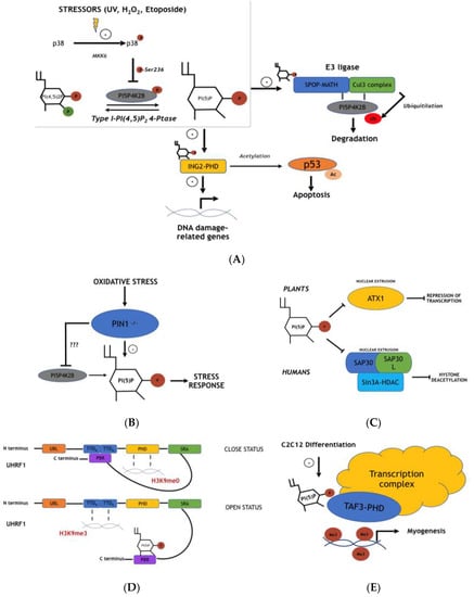 The first evidence of the major role of PI5P in nuclei was found by Gozani et al. in 2003 (Figure 2A) [,,]. Here, the authors demonstrated that ING2 could bind mono-phosphoinositides, particularly PI5P. Inhibitor of growth (ING) enzymes represent a family of proteins characterized by five members, ING1–5, which are able to associate to histone acetyltransferases (HAT), histone deacetylases (HDAC), and acetyl-transferase complexes, and are involved in cell survival, cell cycle, and apoptosis [,,]. For these reasons, INGs are considered to be either oncogenes or oncosuppressors, and their expression has been found to be down regulated in many tumor types. Indeed, ING1–5 expression is positively involved in p53-related apoptosis. INGs can lead to enhanced acetylation of p53 both directly (p300 and HAT activity) or indirectly (NAD-dependent deacetylase sirtuin-1/SIRT1 inhibition) by increasing its activity [,,]. Every ING isoform shares an identical N-terminal domain and a very similar C-terminal part. The latter is characterized by the presence of nuclear localization signal sequences and by a plant homeo domain (PHD) finger, a Cys4-His-Cys3 motif present in enzymes involved in chromatin regulation. ING2 was identified as a PI5P binding protein using different approaches, including PtdInsP-affinity resin, protein-lipid blot assay, and surface plasmon resonance (SPR) []. Notably, it is able to bind slightly to PI3P and PI(3,5)P2. In particular, the PHD zinc finger motif has been described as indispensable for PI binding. Indeed, a zinc chelator, TPEN [], has been shown to be able to decrease PI5P-ING2 interaction. Moreover, NMR solution analyses of the PHD finger structure revealed three lysine residues (K49, K51, and K53) as part of a basic stretch on the protein surface involved in the binding of PI5P. The PHD finger presence in different enzymes was then described as being involved in different PI bindings. Interestingly, strong PI5P induction at the plasma membrane, due to expression of the bacterial protein IpgD, was shown to strongly recruit ING2 out of the nucleus. This was confirmed by overexpression of PIP4K2B, able to modulate PI5P levels in the nuclei, which was sufficiently able to alter the ING2-association with the chromatin/nuclear matrix. Furthermore, as already stated, ING2 is involved in p53 acetylation and related apoptosis. Authors, then, have demonstrated that only overexpression of wild type ING2 can lead to effects on p53 acetylation status and cell viability, while ING2 mutants, lacking PIP binding sites, are not able to affect this process. In addition, induction of p53 acetylation, increases in p21 levels, and apoptosis due to etoposide treatment are inhibited when the isolated PHD finger of ING2 is expressed. As this domain can bind PI5P, it acts as a dominant negative factor in ING2-p53 mediated cell death. Altogether, the data summarized here described PI5P as a pivotal player in ING2 function and localization. Nevertheless, how and why PI5P levels change upon cellular stress and/or if ING2 is able to sense this phenomenon were not completely demonstrated.