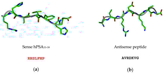Figure 2. Predicted structures of (a) sense hPSA peptide epitope RHSLFHP (red) and (b) antisense peptide paratope AVRDKVG obtained with the PEPstrMOD method [46].