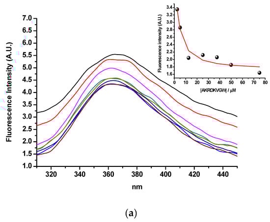 The binding of hPSA peptide RHSLFHP and its antisense peptide AVRDKVG was evaluated by means of tryptophan fluorescence spectroscopy [19,20,49]. Tryptophan was added to the C-terminus of the antisense peptide (AVRDKVGW) to enable the fluorescence measurement. Singular value decomposition analysis suggested only two spectrally active species, one of the antisense paratope AVRDKVGW and the other of the complex of AVRDKVGW with its binding partner, RHSLFHP, since RHSLFHP was not spectrally active in fluorescence mode. The results in Figure 3a, suggest a 1-to-1 complex formation, without any higher order complexes. This model is given by equations (1) and (2), where Kd is the dissociation constant of the complex: