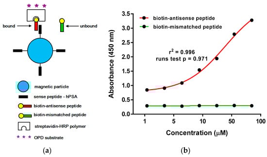 Figure 4. (a) Schematic representation of the magnetic particle enzyme immunoassay (MPEIA) based on the binding of sense hPSA peptide epitope coated onto SPHERO™ carboxyl magnetic particles and biotinylated antisense peptide paratope. (b) Detection of hPSA epitope RHSLFHP by magnetic particle enzyme immunoassay, using biotinylated antisense peptide AVRDKVG (red titration curve). Biotinylated mismatched peptide EHFRW was a negative control (green titration curve).