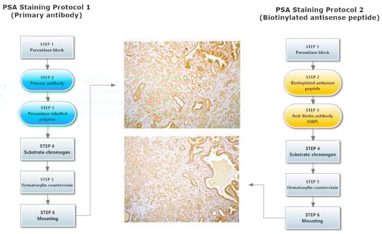 Figure 5. Two hPSA immunohistochemical staining protocols. The first is based on standard immunohistochemistry using a primary antibody (Protocol 1), while the second method is a novel procedure based on a biotinylated antisense peptide (Protocol 2).