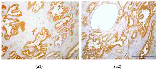 Figure 6. (a1,b1,c1) Immunohistochemical staining of three different hPSA tissue samples with standard monoclonal antibody ER-PR8 (dilution 1:100). (a2,b2,c2) Immunohistochemical staining of three different hPSA tissue samples with biotinylated antisense peptide AVRDKVG (dilution 1:100). The black line in the lower right corner denotes the scale bar (0.5 mm).