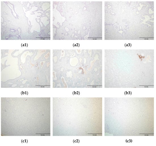 Figure 7. (a1, a2, a3) Negative control peptide: Immunohistochemistry (IHC) staining of the prostate tissue with a peptide Biotin-EHFRW that does not bind to hPSA epitope RHSLFHP. (b1, b2, b3) Negative control antibody―prostate tissue: IHC staining with CD20 (L26) monoclonal antibody; only inflammatory cells are stained. (c1, c2, c3) Negative control tissue―liver tissue: IHC staining with the antisense paratope Biotin-AVRDKVG that binds to hPSA epitope RHSLFHP. Scale bar = 0.5 mm.