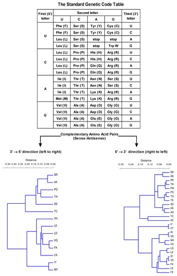 Scheme 1. Twenty amino acids and three stop codons for the protein synthesis are specified by the genetic code, using sixty-four 3-letter codons (top). The number of antisense amino acids and related complementary pairs depends on the direction of codon translation (bottom) [19,20]. For the complementary (sense–antisense) pairs of the genetic code translated in a 3′ to 5′ direction r = 0.85, and for the complementary (sense–antisense) pairs of the genetic code translated in a 5′ to 3′ direction r = 0.86 (single linkage algorithm, Gower similarity index; PAST software 3.16).