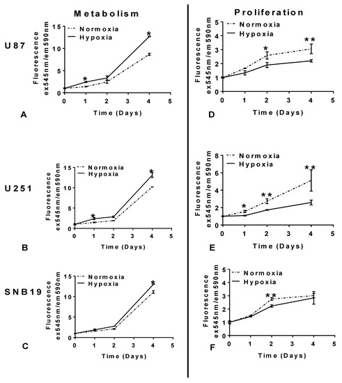 To determine the effect of hypoxia on proliferation and metabolism over time, U87, U251, and SNB19 cell lines were cultured in hypoxic conditions and compared with cells maintained in normoxia for 4 days. We observed that while metabolism was enhanced in hypoxia, it was reduced in normoxia (Figure 1A–C). In contrast, while proliferation was enhanced in cells maintained in normoxia, it was reduced in hypoxia (Figure 1D–F). Our findings suggest that glioblastoma cells adapt to hypoxic (1% oxygen) microenvironment by enhancing metabolism while limiting proliferation.