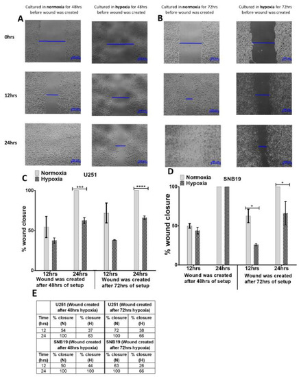 Exposure to hypoxia reduces migration in glioblastoma cells. Representative micrograph of the effect of hypoxia on migration in U251 glioblastoma cell line after 48 h (A) and 72 h (B) exposure to hypoxia. U251 cells were seeded with a seeding density of 1,000,000 c/w in a 6-well plate. The cells were either maintained in normoxia (20% oxygen)—left side—or hypoxia (1% oxygen)—right side. At either 48 h or 72 h of culture in either normoxia or hypoxia, a wound was created with a P200 tip. Pictures were taken with a Nikon microscope at 0 h, 12 h, and 24 h after the wound was created. The photomicrographs show the migration of U251 cells into the scratched area. (C,D) Graphical representation of percentage wound closure in the U251 (C) and SNB19 (D) cell lines. The closure of the wound was calculated as a percentage relative to the wound created at 0 h of wound creation (E) Percentage closure of wound after 48 h and 72 h exposure to hypoxia in U251 and SNB19 cell lines. Picture is representative of experiment repeated at least 3 times. * p < 0.05, *** p < 0.001, **** p < 0.0001. Scale bar = 500 µm.