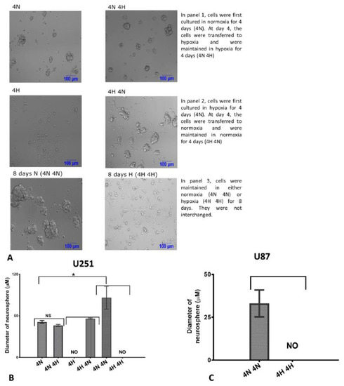 Hypoxia (1% oxygen) impairs the formation of neurospheres: (A) 1% oxygen tension impairs the formation of neurospheres. U251 cells were cultured as neurospheres with seeding density of 20,000 cells/well in a 24-well plate. At day 0 of setup, indicated groups were either maintained in normoxia or transferred to hypoxia. The condition of each group is indicated beside the pictures. The pictures are representative of experiment conducted at least 3 times. Scale bar = 100 µm. n = Normoxia, H = Hypoxia, D = Day. (B,C) Diameter of neurospheres formed in U251 (B) and U87 (C) following exposure to hypoxia: a Nikon confocal microscope was used to measure the width of neurospheres at the indicated days. The error bar indicates the average from two independent experiments. NS = Not significant, NO = Not obtained. * p < 0.05.