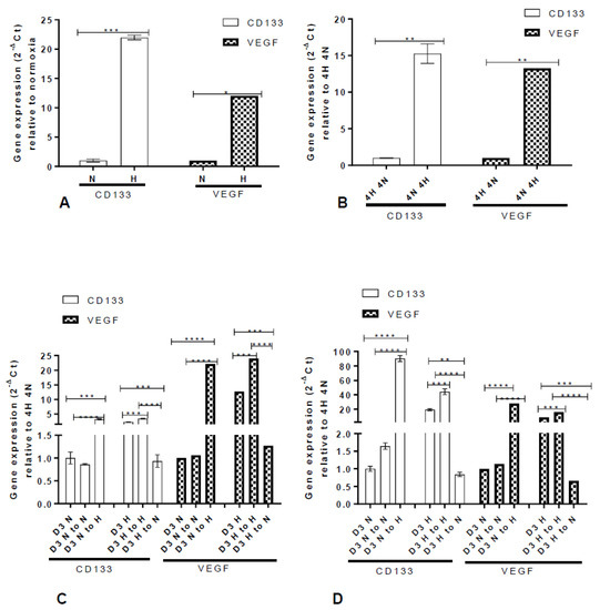 Reversibility of CD133 and VEGF mRNA expression following culture from hypoxia to normoxia. (A,B) U251 cells were cultured under normoxic (N) or hypoxic (H) conditions. CD133 and VEGF mRNA levels were quantified at day 4 using qRT-PCR (A). The cells cultured in hypoxia were subsequently re-oxygenated (20% oxygen) 4H 4N, while cells cultured in 20% oxygen were re-cultured in hypoxia (1% oxygen) 4N 4H. After 4 days, CD133 and VEGF mRNA levels were quantified using qRT-PCR (B). U87 (C) and U251 (D) cells were cultured in normoxia (D3N) and hypoxia (D3H) for 3 days. At day 3 in both conditions, the cells were harvested. Normoxia cells (D3N) were re-cultured in either normoxia (D3N to N) or hypoxia (D3N to H). Likewise, hypoxic cells (D3H) were re-cultured in either hypoxia (D3 H to H) or normoxia (D3 H to H). The cells were maintained for 3 days and mRNA expression of CD133 and VEGF was ascertained with qRT-PCR. The error bars represent an average of 3 independent experiments. One-way ANOVA (Prism7) was used for statistical comparison. ** P < 0.01, *** P < 0.001. **** P ˂ 0.0001.