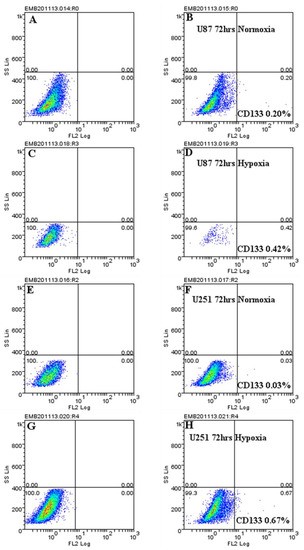 CD133 protein is upregulated under hypoxic conditions. U87 (A–C), and U251 (E–H) cells were cultured under normoxic (A,B,E,F) and hypoxic (C,D,G,H) conditions for 72 h. For both conditions, the total isotype control cell populations (A,C,E,G) are presented based on side and scatter properties, and appropriate regions are gated and used to compare cells stained with the anti-CD133 antibody (B,D,F,H). The percentages of cells expressing CD133 after 72 h are indicated. The analyses were performed using Weasel software. The results are representative of at least 3 independent experiments.