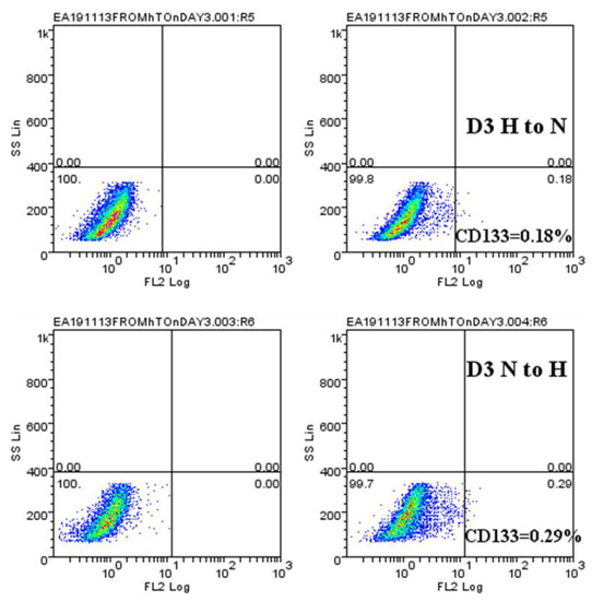When cells were exposed to hypoxia, CD133 mRNA was upregulated (Figure 4A). Similarly, VEGF mRNA, which was used as a positive marker for hypoxia, was upregulated (Figure 4A). However, we observed that both CD133 and VEGF mRNAs returned to baseline when the cells were returned to normoxia (Figure 4B). This was also observed with OCT4 mRNA (Figure S1). To further validate this finding, U87 and U251 cells were cultured in normoxia (D3N) and hypoxia (D3H) for 3 days. At day 3 in both conditions, the cells were harvested, and CD133 gene and protein expression determined. Cells cultured in normoxia (D3N) were re-cultured in either normoxia (D3 N to N) or hypoxia (D3 N to H). Similarly, cells cultured in hypoxia (D3H) were re-cultured in either hypoxia (D3 H to H) or normoxia (D3 H to N) (Figure 4C,D). The cells were then maintained for 3 days and CD133 mRNA and protein and VEGF mRNA expression ascertained (Figure 4 and Figure 5). The results revealed that the CD133 stem cell marker returned to baseline both at the gene and protein level when the cells were moved from a hypoxic environment to normoxia (i.e., re-oxygenation) (Figure 6), confirming the concept of reversibility.