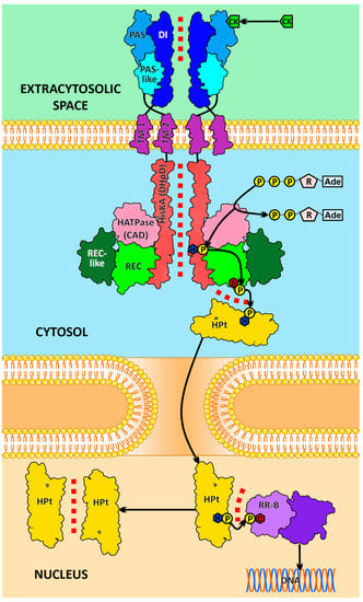 - Bhate, M.P.; Molnar, K.S.; Goulian, M.; DeGrado, W.F. Signal transduction in histidine kinases: Insights from new structures. Structure 2015, 23, 981–994. [Google Scholar] [CrossRef] [PubMed]