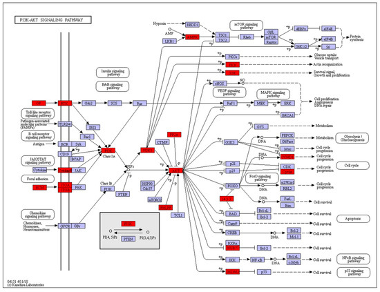Model of activation of the PI3K/AKT signalling pathway in mink uteri in activated versus diapause states. Differentially expressed genes are shown in red color. Genes in blue boxes were present in the mink transcriptome but not differentially expressed.