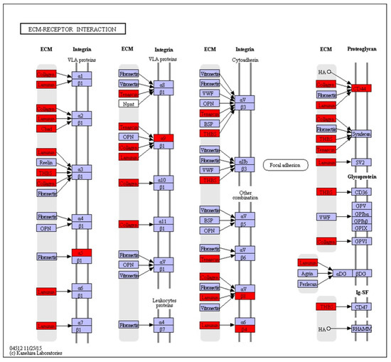 KEGG pathway enrichment analysis was performed on these DEGs and a cut-off criterion of p < 0.05 was also used. A total of 18 enriched pathways were found between the activated and diapause groups. The classification indicated that the PI3K-Akt signaling pathway (Figure 1), focal adhesion, ECM-receptor interaction (Figure 2), cell adhesion molecules and protein digestion and absorption were highly enriched. The top 10 KEGG pathways are shown in Table 4. The most significantly enriched pathways were those responsible for cell adhesion and those involved in extracellular matrix remodeling, highly enriched genes included CD44, LAMA1–5, ITGB4, ITGA5, ITGB8, COL4A, ITGAM and LAMC3. Genes in the pathways related to immune gene expression, such as COL1AS, COL6A, FGFR4, XPNPEP2, IL1A and MHC2 were likewise enriched.