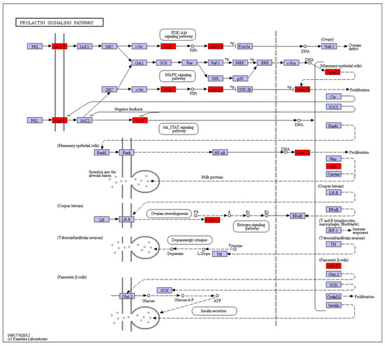 - Berlanga, J.J.; Gualillo, O.; Buteau, H.; Applanat, M.; Kelly, P.A.; Edery, M. Prolactin activates tyrosyl phosphorylation of insulin receptor substrate 1 and phosphatidylinositol-3-OH kinase. J. Biol. Chem. 1997, 272, 2050–2052. [Google Scholar] [CrossRef] [PubMed]