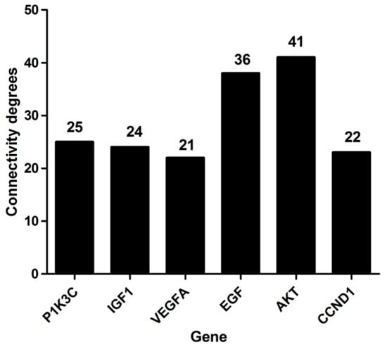 Protein-protein interactions (PPIs) analysis can reveal the protein function of DEGs at the molecular level. In the present study, we used the STRING database to construct a gene network (Results in Supplementary materials). This network consisted of 354 nodes connected via 697 edges. The highly connected nodes, also known as hub genes, represent important genes in the network. We identified 6 hub nodes with a high connectivity degree >20 (Figure 4). The genes were AKT (41), EGF (36), P1K3C (25), IGF1 (24), CCND1 (22) and VEGFA (21). The data suggest that they play important roles in embryo activation in mink.