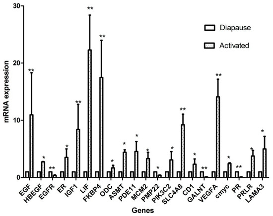 QRT-PCR validation of RNA-Seq data in mink uterus during embryo diapauses and activation: activated/diapause expression ratios. GAPDH was used as the internal control for mRNA analysis. The data shown are from three biological replicates. * p < 0.05, ** p < 0.01.