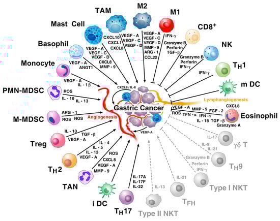 Representation of the immune landscape of human gastric cancer. The immune network in gastric cancer is a complex and dynamic system characterized by multiple interactions between a wide spectrum of immune cells, their mediators and tumour cells. Tumour-associated macrophages (TAM), M2 macrophages, tumour-associated mast cells, basophils, monocytes, polymorphonuclear-myeloid-derived suppressor cells (PMN-MDSCs), monocyte-derived suppressor cells (M-MDSCs), Tregs, Th2 cells, tumour-associated neutrophils (TAN), immature DCs (iDCs), Th17 cells and their mediators play protumorigenic roles. M1 macrophages, cytotoxic CD8+ T cells, NK cells, Th1 cells, mature DCs (mDCs) and their mediators play an anti-tumorigenic role in gastric cancer. VEGF-A and CXCL8 produced by tumour cells can activate tumour angiogenesis. Mast cells and macrophages are major producers of lymphangiogenic factors (VEGF-C and VEGF-D). The anti-tumorigenic role of Th9 cells, type I NKT cells and γδ T cells (grey and dashed lines) have been demonstrated in several other human cancers or are under investigation in gastric cancer. There is increasing evidence that eosinophils play an anti-tumorigenic role in different cancers [,,]. The protumorigenic role of circulating Tfh cells [] and of type II NKT cells has been preliminarily shown in gastric cancer or in several other human tumours, respectively (grey and dashed lines).