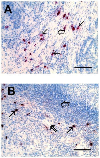The role of mast cells has also been started to be evaluated in metastatic lymph nodes of gastric cancer patients. Although mast cells are rarely found in normal lymph nodes, local mastocytosis was demonstrated in lymph node metastases from primary gastric cancer []. Figure 2A illustrates the localization of tryptase+ mast cells in primary gastric cancer. Interestingly, tryptase+ mast cells were also found in lymph node metastasis from primary gastric cancer (Figure 2B). The role of metastasis-associated mast cells is of great interest considering the contribution of these cells to lymphangiogenesis through the production of lymphangiogenic factors [,,].