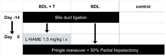 Male Wistar rats weighing 200 to 300 g were housed with free access to water and a standard diet (ssniff-Spezial Diäten GmbH, Soest, Germany) under specific pathogen-free conditions according to the guidelines of the Federation of European Laboratory Animal Science Associations (FELASA) in a temperature- and humidity-controlled environment with a 12 h light and dark cycle. The rats were randomly divided into three groups of 16 rats: (i) the control (non-bile duct ligation (BDL)/no treatment), (ii) the BDL + T (BDL/L-NAME treatment), and (iii) the BDL (BDL/no treatment) group.