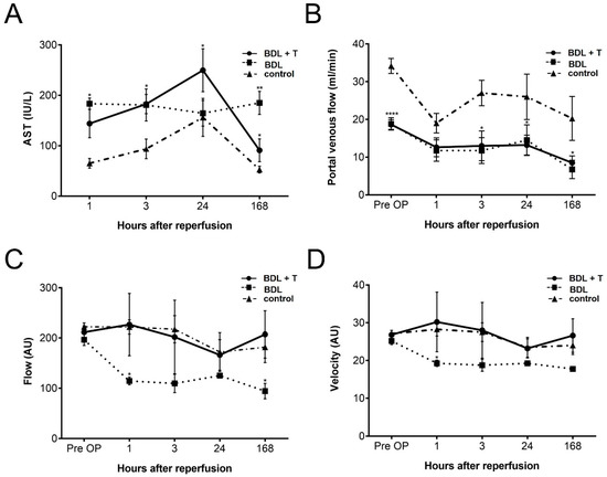 Hepatocellular damage, circulation, and microcirculation in the different treatment groups were analyzed based on (A) serum aspartate aminotransferase (AST) levels, (B) portal venous flow, (C) flow, and (D) velocity pre-operative, 1, 3, 24, and 168 h after reperfusion. Mean and standard deviation are shown in each group with significance levels of * p < 0.05, ** p < 0.01, **** p < 0.0001.