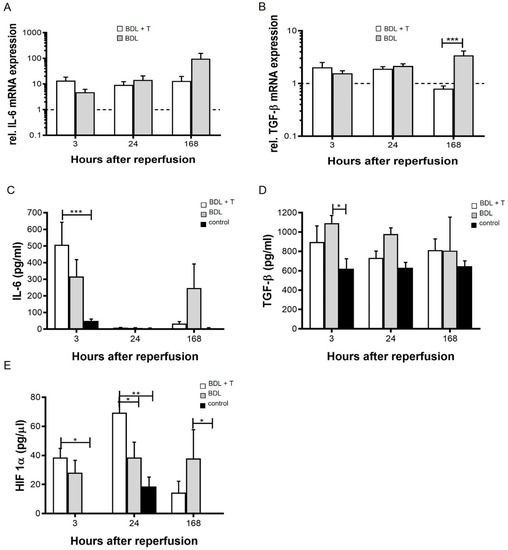 Serum HIF-1α levels were measured after 3, 24, and 168 h of reperfusion (Figure 3E). HIF-1α levels at 3 h after reperfusion were comparable between the BDL + T and BDL group. The BDL + T group showed the highest levels among the three groups at 24 h after reperfusion (69.6 ± 7.4 pg/µL), and there was a significant difference compared with the BDL group (38.6 ± 10.5 pg/µL; p < 0.05). The HIF-1α level in the BDL group at 168 h after reperfusion tended to be higher than that of the BDL + T group, but no significant difference was observed. Animals in the control group showed in general significant lower levels of HIF-1α in comparison to the BDL and/or BDL + T group (3 h, BDL + T vs. control, p < 0.05; 24 h, BDL + T vs. control, p < 0.01; BDL vs. control, p < 0.05; 168 h, BDL vs. control, p < 0.05).