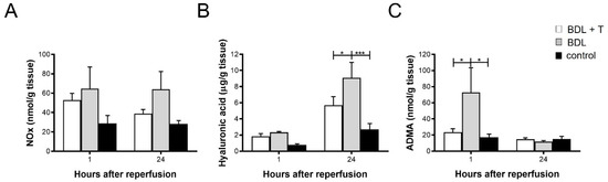Hepatic NOx levels were measured after 1 h and 24 h of reperfusion (Figure 4A). The control groups showed the lowest levels among the three groups, whereas the BDL group showed higher but not significantly higher levels of NOx than the animals in the BDL + T group.