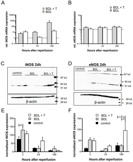 For the analysis of the effect of the L-NAME treatment (BDL + T) inducible nitric oxide synthase (iNOS) and endothelial nitric oxide synthase (eNOS) mRNA levels (A,B) and protein expression (C,D) were determined and quantified by densitometry (E,F). Relative mRNA expression of iNOS (A) and eNOS (B) were measured by RT-qPCR after 3, 24, and 168 h after reperfusion (C, D). Results of protein expression in Western blots are shown 24 h after reperfusion. Densitometry analysis of Western blot results of iNOS (E) and eNOS (F) protein expression. β-actin normalized expression of iNOS and eNOS after 3, 24, and 168 h after reperfusion are shown. Mean and standard deviation are shown in each group with significance levels of * p < 0.05.