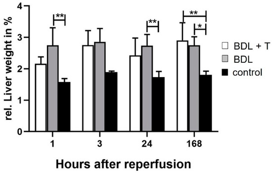 Changes at relative liver weight (in %) were evaluated in animals after 1, 3, 24, and 168 h after reperfusion in the BDL + T, BDL, and control group. Mean and standard deviation are shown in each group with significance levels of * p < 0.05 and ** p < 0.01.