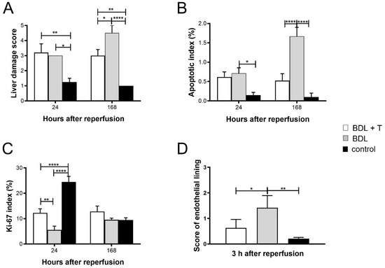 Further histopathological analysis was performed by semi-quantitative scoring for liver damage analyzing hematoxylin and eosin (HE)-stained liver sections. Apoptotic index was evaluated on transferase-mediated d-UTP nick-end labeling (TUNEL) stained tissue sections. Scores for liver damage and apoptotic index values were comparable between the BDL + T and BDL group at 24 h after reperfusion (Figure 7A,B and Figure 8). However, both scores were significantly lower in the BDL + T group than in the BDL group at 168 h after reperfusion (p < 0.05, p < 0.0001). The control group showed significant lower liver damage at each time point analyzed compared to BDL or BDL + T group. Significant lower apoptotic index of the control group was only observed in comparison to the BDL group.