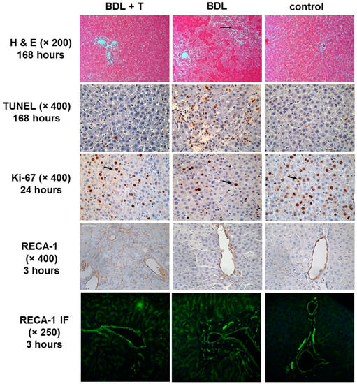 Significant histopathological changes were also manifested by the presence of the proliferation of biliary epithelium (Figure 8, Ki-67) with the formation of bile ductules (Figure 8, HE and Figure S2). In addition, proliferation of Kupffer cells and sinusoidal endothelial cells (Figure 8, Ki-67), and infiltration of inflammatory cells were found (Figure 8, HE arrow). These changes were most pronounced in the BDL group and abrogated in the BDL + T group compared to the control group. This was also confirmed by RECA-1 staining for endothelial cells.