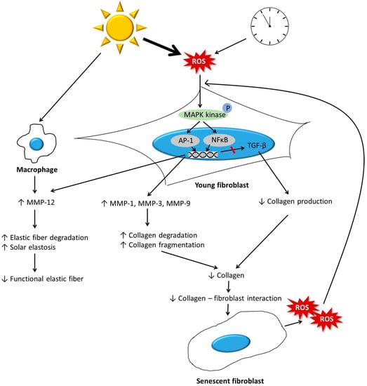 Schematic illustration showing the changes in fibroblasts, collagen, and elastic fibers in the dermal aging process. Reactive oxygen species (ROS) generated in the aging process activate mitogen-activated protein kinases (MAPKs) and induce transcription factors, including activator protein 1 (AP-1) and nuclear factor-κB (NF-κB). This activation increases matrix metalloproteinase (MMP) expression and inhibits transforming growth factor-β (TGF-β) signaling, which leads to collagen fragmentation and decreased collagen biosynthesis. This hinders the mechanical interaction between fibroblasts and the extracellular matrix (ECM), and consequently reduces the size of dermal fibroblasts. Aged fibroblasts produce a greater amount of ROS that further increases the expression of MMPs and inhibits TGF-β signaling, creating a positive feedback loop that accelerates dermal aging. MMP-12 secreted from fibroblasts and macrophages plays a crucial role in the development of solar elastosis and in the reduction of functional elastic fibers.