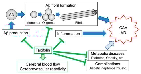 Pleiotropic beneficial effects of taxifolin. Taxifolin suppresses Aβ production, fibril formation, and neuroinflammation in the brain. It also ameliorates cerebrovascular dysfunction. Furthermore, taxifolin beneficially affects certain metabolic diseases with a high risk for neurodegenerative diseases and their complications. These direct and indirect effects of taxifolin would contribute to preventing and/or treating Aβ-associated cognitive dysfunction including CAA and AD. Aβ: amyloid-β; CAA: cerebral amyloid angiopathy; AD: Alzheimer’s disease.