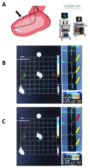 Schematic of the interventional procedure and intracardiac ECG. (A) NOGA mapping catheter in the left ventricular cavity touching a fixed endocardial surface point of the ischemic distal anterior wall (white arrow), measuring the endocardial voltage signals and intracardiac ECG; intracoronary balloon in the mid-left anterior descending coronary artery (black arrow), after the origin of the second diagonal branch) (left panel). NOGA equipment enabling online recording of the electrophysiological parameters, and intracardiac and surface ECG (right panel); (B) NOGA single point mapping with surface and intracardiac ECGs before the intracoronary balloon occlusion. Note the iso-electric ST-segment in both (yellow arrow); and, (C) Intracardiac ST-elevation during intracoronary balloon occlusion (red arrow), and the iso-electric ST-segment in surface ECG (yellow arrow).