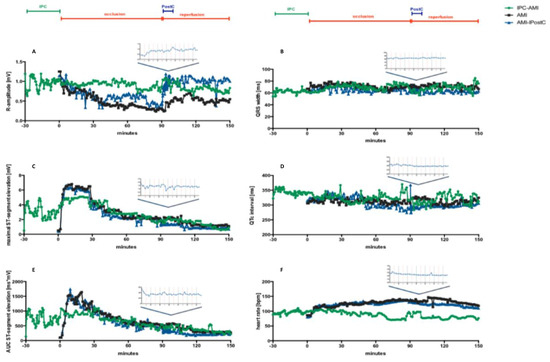 Continuous recording of the ischemia and conduction-related electrophysiological parameters. (A) R-amplitude, (B) maximum ST-elevation, (C) ST area under the curve (AUC-ST), (D) QRS width, (E) QTc interval, and (F) heart rate. Green line: group ischemic preconditioning-acute myocardial infarction (IPC-AMI), black line: group AMI, blue line: group AMI-PostC.