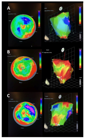 Several electrophysiological effects of IPC and PostC have been documented in surface ECGs, including increased ST-segment resolution; reduced QT dispersion, T-amplitude, and corrected QT time (QTc); shortened action potential duration (APD); and, changes in myocardial tissue resistivity [30,31,32,33,34,35]. The NOGA® (Cordis, a Johnson & Johnson company, Irwindale, CA, USA) electromechanical mapping system is capable of simultaneously recording electrical and mechanical data inside the left ventricle (LV), which creates a three-dimensional virtual electroanatomical map and providing information on the viability of the myocardium. In addition, the catheter captures intracardiac ECG, which is much more sensitive than the surface ECG.