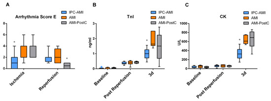 Arrhythmia score and enzymatic infarct size assessment. (A) Arrhythmia score, (B) Serum level of troponin I (TnI). (C) Serum level of creatine kinase (CK). * p < 0.05 for IPC-AMI group vs. AMI/AMI-PostC groups during ischemia (A) and at three day (d) follow-up (B and C).