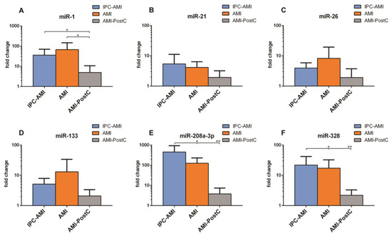 Plasma levels of (A) miR-1, (B) miR-21, (C) miR-26, (D) miR-133, (E) miR-208a-3p and (F) miR-328 in groups. IPC-AMI, AMI and AMI-PostC, quantified by qPCR, immediately after the 60 min reperfusion period. Fold changes (y axis) are relative to baseline values of the individual animals. * p < 0.05, ** p < 0.01.