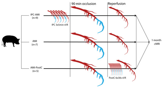 The animal experiments were performed at the Institute of Diagnostic Imaging and Radiation Oncology, University of Kaposvar, Hungary (Approval number: SOI/31/26-11/2014). The study was conducted according to the “Position of the American Heart Association on Research Animal Use”. Figure 7 shows the study design. Twenty-one domestic pigs (Sus scrofa, female large whites, 30 ± 2 kg, 3=three months of age) were classified into three groups: reperfused AMI with IPC (IPC-AMI group, n = 9), reperfused AMI with PostC (AMI-PostC group, n = 5), or reperfused AMI without any cardioprotective procedure (AMI group, n = 7). All of the percutaneous procedures were performed under general anesthesia using a femoral access site. Intracardiac ECG was continuously recorded by the NOGA Star electroanatomical mapping catheter and an arrhythmia score was calculated. At the four-week follow-up, LV dimension, function, and infarct size were measured by cardiac magnetic resonance imaging with late enhancement.