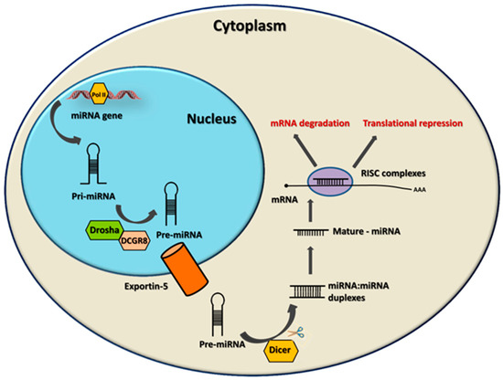 Biogenesis of microRNA (miRNA). miRNAs genes are transcribed as primary miRNAs (pri-miRNAs) by RNA polymerase II (Pol II) in the nucleus. The pri-miRNAs are cleaved by the Drosha–DGCR8 complex to produce a precursor miRNA (pre-miRMA), which is then exported to the cytoplasm by the exportin-5-RNA GTP complex. In the cytoplasm, the pre-miRMA is further processed by Dicer to a short RNA duplex. One strand is degraded, while the mature miRNA is incorporated into the RNA-induced silencing complex (RISC), which leads to targeting an mRNA, leading to its degradation or the repression of translation.