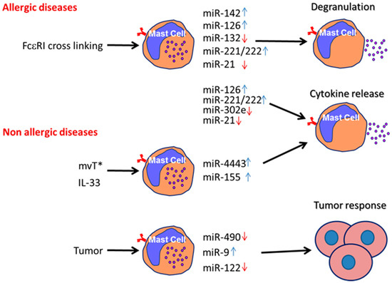 This review summarizes the possible roles of various miRNAs in different pathways of MC activation and function, including IgE-mediated allergic response, non-allergic response such as activation by mvT* or by several cytokines, and at the site of malignant tumors (Figure 2). MiRNAs act both as inducers or suppressors of MC activation and function depending on MC triggers, origin, and inflammatory disorders by affecting different targets participating in MC activation (see more details in Table 1). Thus, certain miRNAs may be considered as a potential therapeutic approach in the management of inflammatory processes where MC have been found to participate. Clearly, miRNAs are potential noninvasive biomarkers, and the modulation of their expression can be used for therapeutic purposes.
