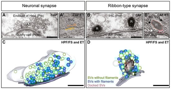 The nanoarchitecture of an excitatory neuronal and ribbon-type synapses. (A) Electron micrograph of an individual active zone (AZ) from a mature murine endbulb of Held (presynaptic compartment, Pre) in the anteroventral cochlear nucleus projecting onto a Bushy cell (postsynaptic compartment, Post). (B) Electron micrograph of ribbon (R) synapses formed by inner hair cells (IHC, Pre) and afferent fibers (Aff., Post). (A’) Example virtual section obtained from electron tomography (ET) on samples prepared by conventional aldehyde fixation (CAF), showing synaptic vesicle clusters (SVC) at the AZ (brown). (B’) At ribbon synapses, two morphological SVs pools are present. The ribbon-associated (RA)-SVs (with black arrows) are arranged in a halo around the synaptic ribbon (R, red outline). The membrane-proximal (MP)-SVs (with white arrow) are located near the AZ membrane around the presynaptic density (PD, pink outline). (C,D) Tomogram models rendered from high-pressure frozen and freeze substituted (HPF/FS) synapses allow the visualization of SVs and tethering in 3D at a near-to-native state. Delicate filaments associated with SVs have been investigated using these methodologies. SVs with filaments (blue) and without filaments (green) are shown, along with morphologically docked SVs (magenta) at a neuronal (C) and a ribbon-type synapse (D). All scale bars are 200 nm. (A,A’) and the tomogram for the 3D model in C are kindly provided by Anika Hintze, Institute for Auditory Neuroscience, University Medical Center Göttingen.