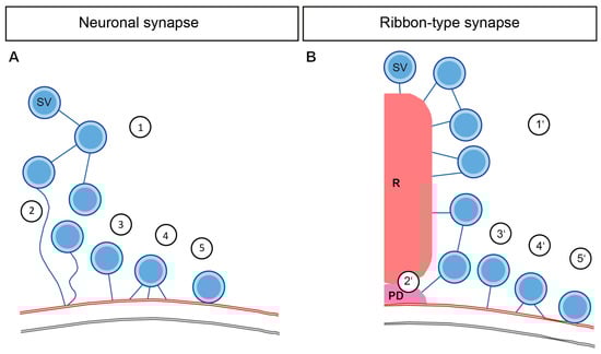 While many important molecules are conserved across chemical synapses, the sensory ribbon-type synapses appear more specialized, where graded membrane potentials trigger exocytosis at these synapses [,,,,,,]. Ribbon synapses are present in vertebrate sensory systems such as in auditory hair cells [,,] (Figure 1B,B’), in vestibular hair cells [,,], photoreceptors [,] and retinal bipolar cells [,]. Further, they are also found in lower vertebrate pinealocytes in the pineal gland [], fish lateral lines [,], and electroreceptors [,], as well as in frog saccular or turtle [,] hair cells. They all share a structural specialization appearing as a large electron-dense projection, the synaptic ribbon, which can reach in the photoreceptor a size of several hundreds of nanometers, and this way is capable to cluster a large number of SVs [,,]. Some ribbon-type synapses maintain the highest rates of exocytosis documented so far [,,], releasing even up to hundreds of SVs per second at an individual synapse for an extended period of time [,,].