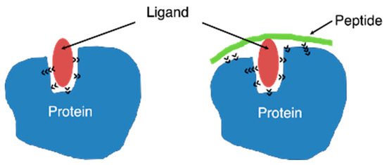 Schematic showing how a peptide conjugated to a ligand (folate) enhances the affinity of the ligand toward the target protein (folate receptor). The black arrowheads indicate molecular interactions.