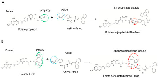 Reaction schemes for the click reactions of folate-propargyl and folate-DBCO with AzPhe-Fmoc are shown in Figure 2. A 1 mM stock of folate-propargyl and a 10 mM stock of BimH3 were prepared in DMSO for CuAAC. A 10 mM stock of AzPhe, sodium ascorbate, 2 mM stock of copper (II) sulfate (CuSO4) and copper (I) chloride (CuCl) were prepared in H2O.