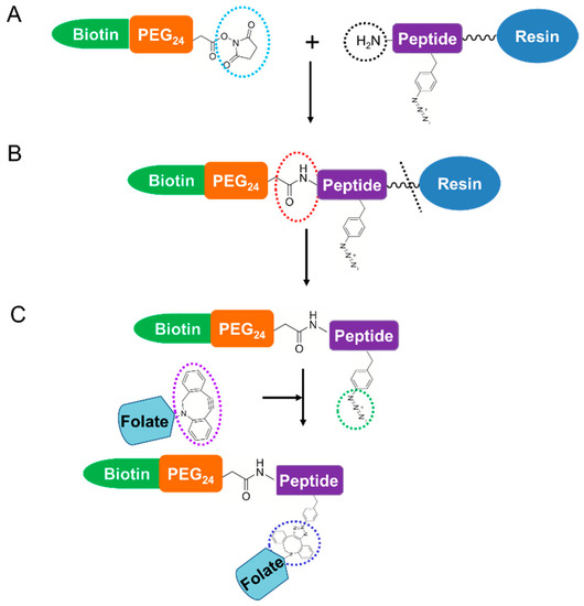 Synthesis procedure for peptide conjugates. (A) N-terminal peptide modification with biotin-PEG24 was achieved by reacting ester NHS (cyan dotted circle) and the NH2 group of the peptide (black dotted circle).The black wavy line between resin and peptide indicated various peptide lengths. (B) After the N-terminal modification with biotin-PEG24, the amide bond (red dotted circle) was formed. Next, peptide was cleaved from resin (black dotted line). (C) The folate-DBCO-AzPhe containing peptide was achieved by the SPAAC click reaction between DBCO (purple dotted circle) of the folate and azide groups (green dotted circle) of the AzPhe in the peptide to form the folate-peptide conjugate via the dibenzocyclooctyne triazole (blue dotted circle).