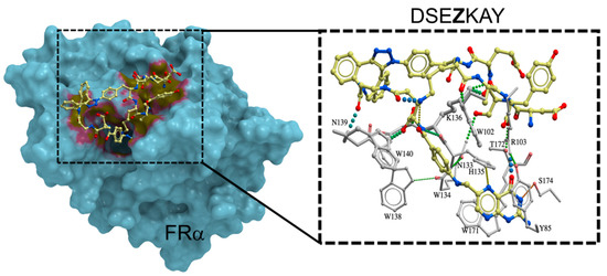 Figure 5 shows the results of the docking simulation, which demonstrates the interaction mode of DSEZKAY with FRα. As expected in Figure 1, the structure of the complex shows an increase in the number of interactions to FRα from the peptide portion around the folate-binding pocket. Previous reports have demonstrated greater than 100-fold increases in binding affinity by peptide conjugates [25,26,27], whereas the present result was lower than these previous increases in affinity. However, the present investigation also revealed that peptide conjugation is a useful tool to enhance the binding affinity to the target molecule. Future efforts will focus on using the folate-peptide conjugate to target anti-cancer drug delivery.
