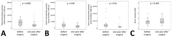 Similar to these classical laboratory parameters, medium EVs were significantly reduced one year after surgery by 59% (Figure 1A). When analyzing phosphatidylserine (PS)+ and PS– vesicles by AnnexinV staining we found that the reduction was significant only for AnnexinV– vesicles. Levels of Annexin V+ vesicles were reduced by 56% with a p = 0.06 whereas AnnexinV– vesicles showed a statistically significant reduction of 62% one year after surgery (Figure 1B). No reduction for AnnexinV+ vesicles was observed using a specific ELISA for Annexin V+ extracellular vesicles (Figure 1C).